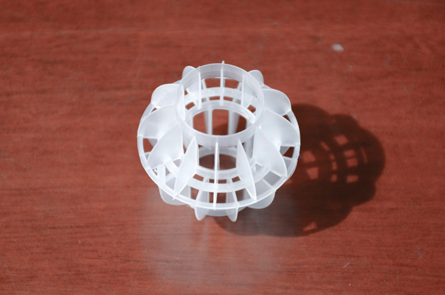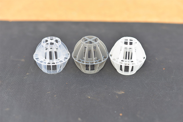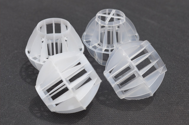 多面空心球中間鏤空結構形成空隙大,不易被阻塞的特性。這種結構在空氣洗滌、廢氣吸收、灰塵過濾等廢氣處理工程方面應用,具有處理風量大、阻力小的特點。由于多面空心球的空隙中有較高的滯液量,可使塔內液體停留時間長,從而增加了氣體與液體的接觸面積和接觸時間,便廢氣得到充分吸收處理。