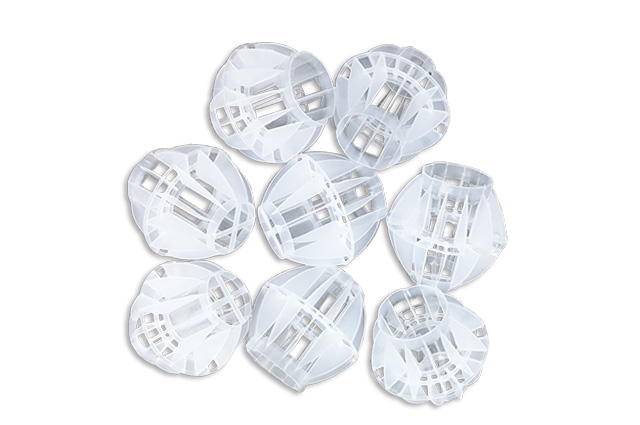 多面空心球中間鏤空結構形成空隙大,不易被阻塞的特性。這種結構在空氣洗滌、廢氣吸收、灰塵過濾等廢氣處理工程方面應用,具有處理風量大、阻力小的特點。由于多面空心球的空隙中有較高的滯液量,可使塔內液體停留時間長,從而增加了氣體與液體的接觸面積和接觸時間。