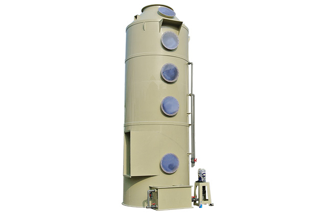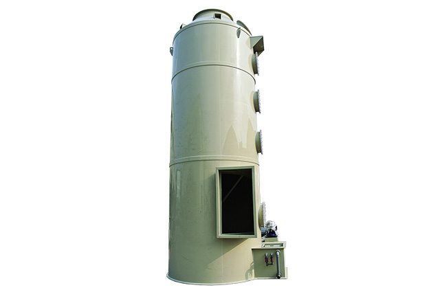 旋流塔是處理粉塵設備,結構與噴淋塔結構同樣,主要是由格柵板填料改變為旋流葉片、噴淋系統。右下往上,分別是:順時針葉片加噴淋系統;旋流塔內設計多套旋流裝置,經過初級凈化的煙氣旋轉上升,由于旋流裝置設計合理,旋流氣動裝置具有導向和接力作用,利用煙氣自身的動能產生氣動旋流,氣液兩相充分接觸,進行傳質反應,逆時針葉片加噴淋系統,起到一個順逆兩相氣體相沖變化,從而使粉塵流入塔底;大小頭除霧層,起到一個不能讓水份跟隨氣體流出排放。