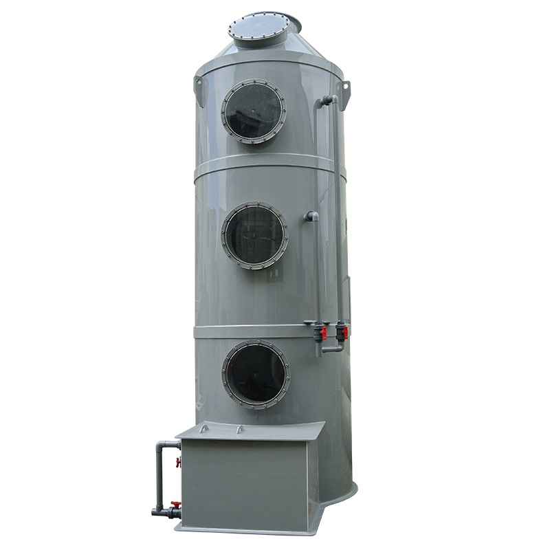 PPs阻燃噴淋塔廢氣處理原理:PPs噴淋塔處理廢氣機制為氣液逆流接觸。以酸性廢氣為例,酸性廢氣由塔底進入,pp噴淋塔循環水泵開啟后,水箱內堿性液體由塔頂進入,經過噴淋裝置(噴嘴)噴成霧狀或雨滴狀;氣液逆流,在填料層酸堿中和。凈化后氣體經過除霧大小頭后排出。--噴淋塔的結構組成:酸堿廢氣塔分單塔體和雙塔體以及立式噴淋塔與臥式噴淋塔。用法蘭分段連接而成。具體由貯液箱、塔體、進風段、噴淋層、填料層、旋流除霧層、出風錐帽、觀檢孔等組成。